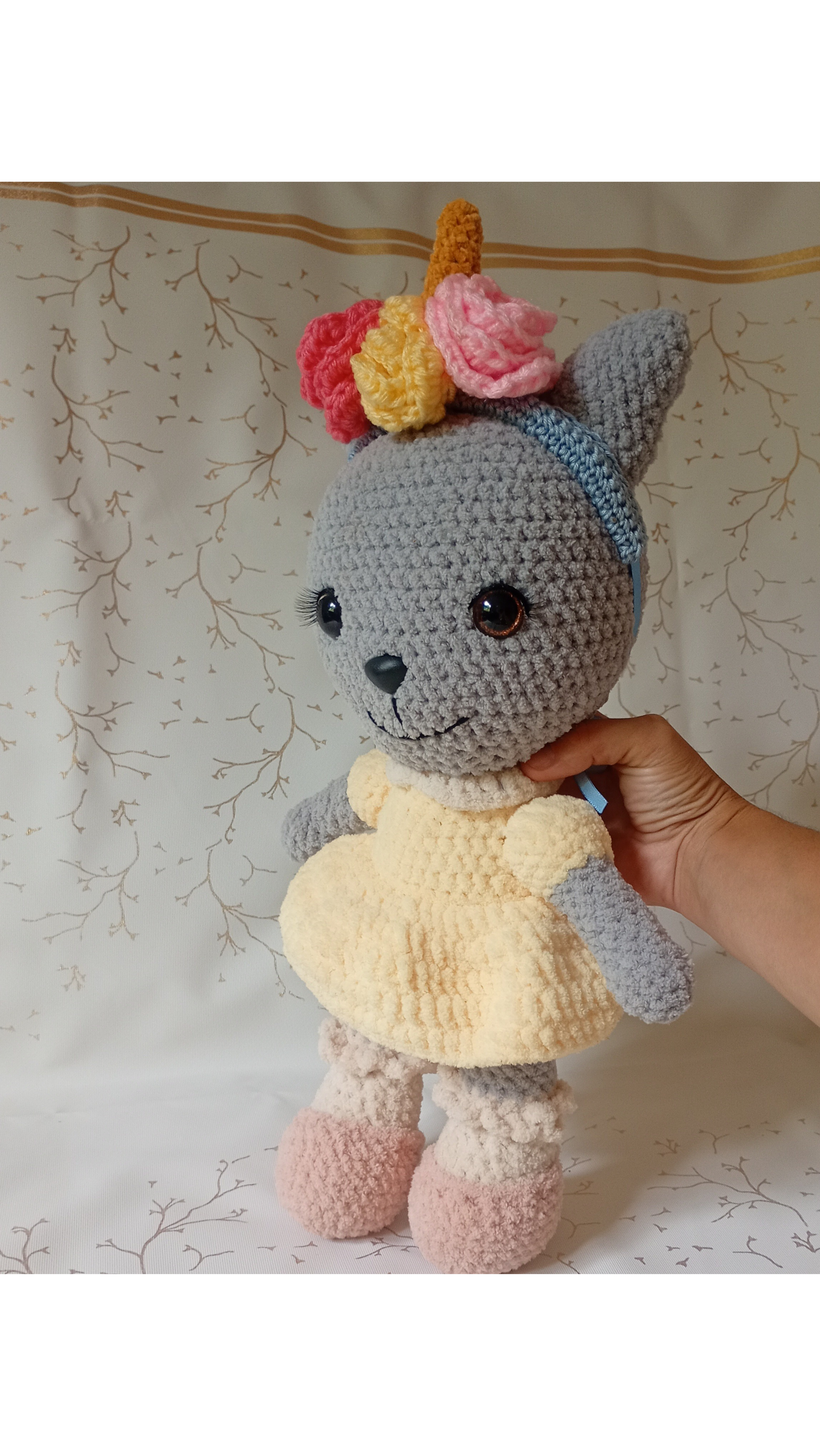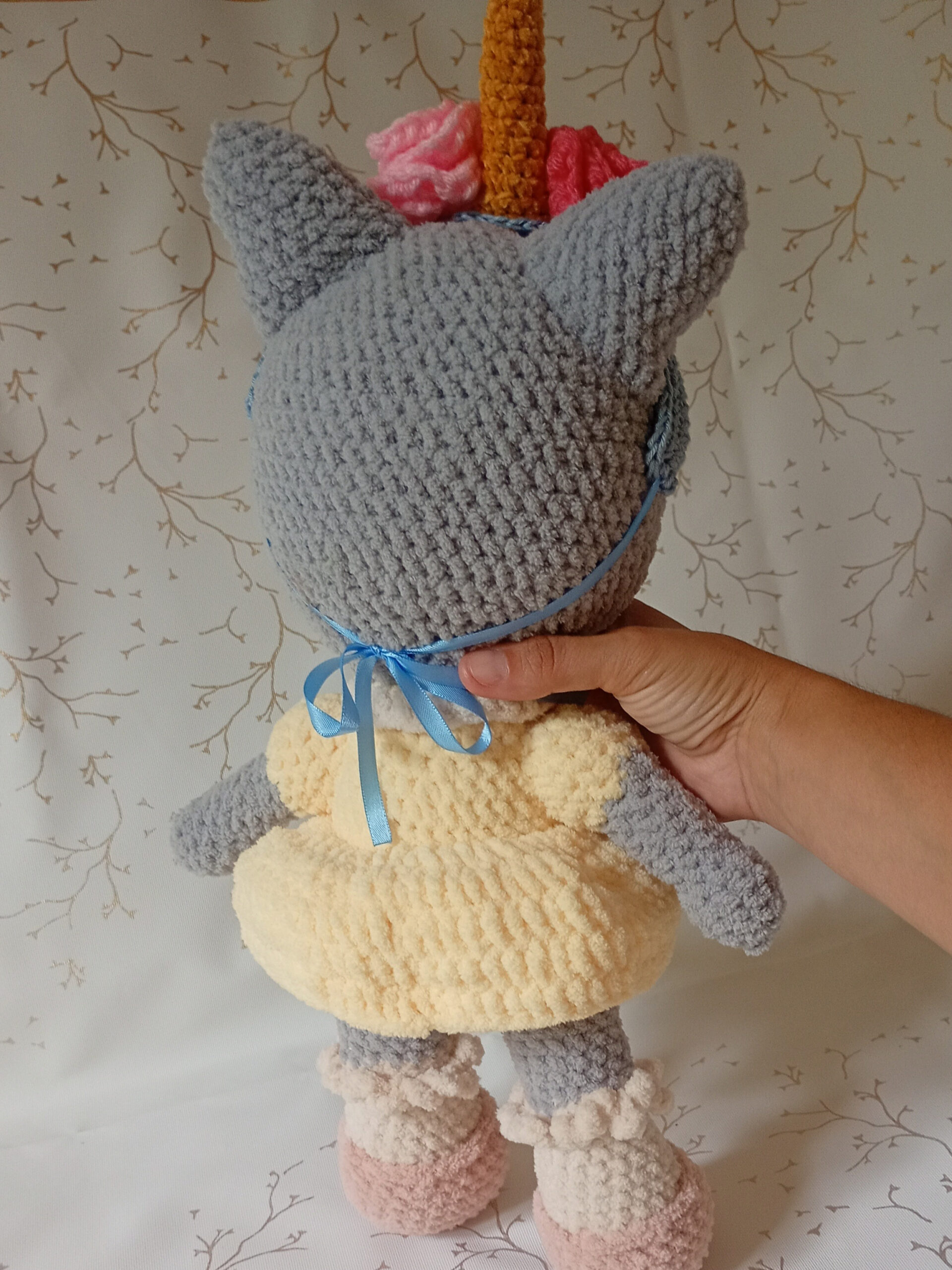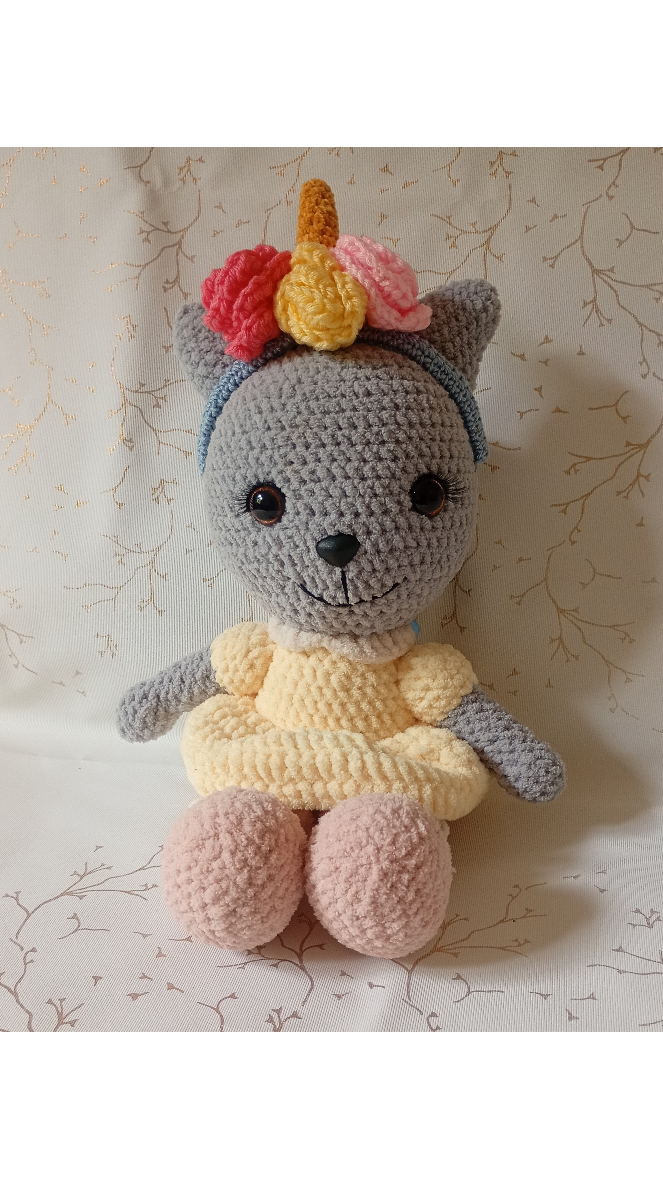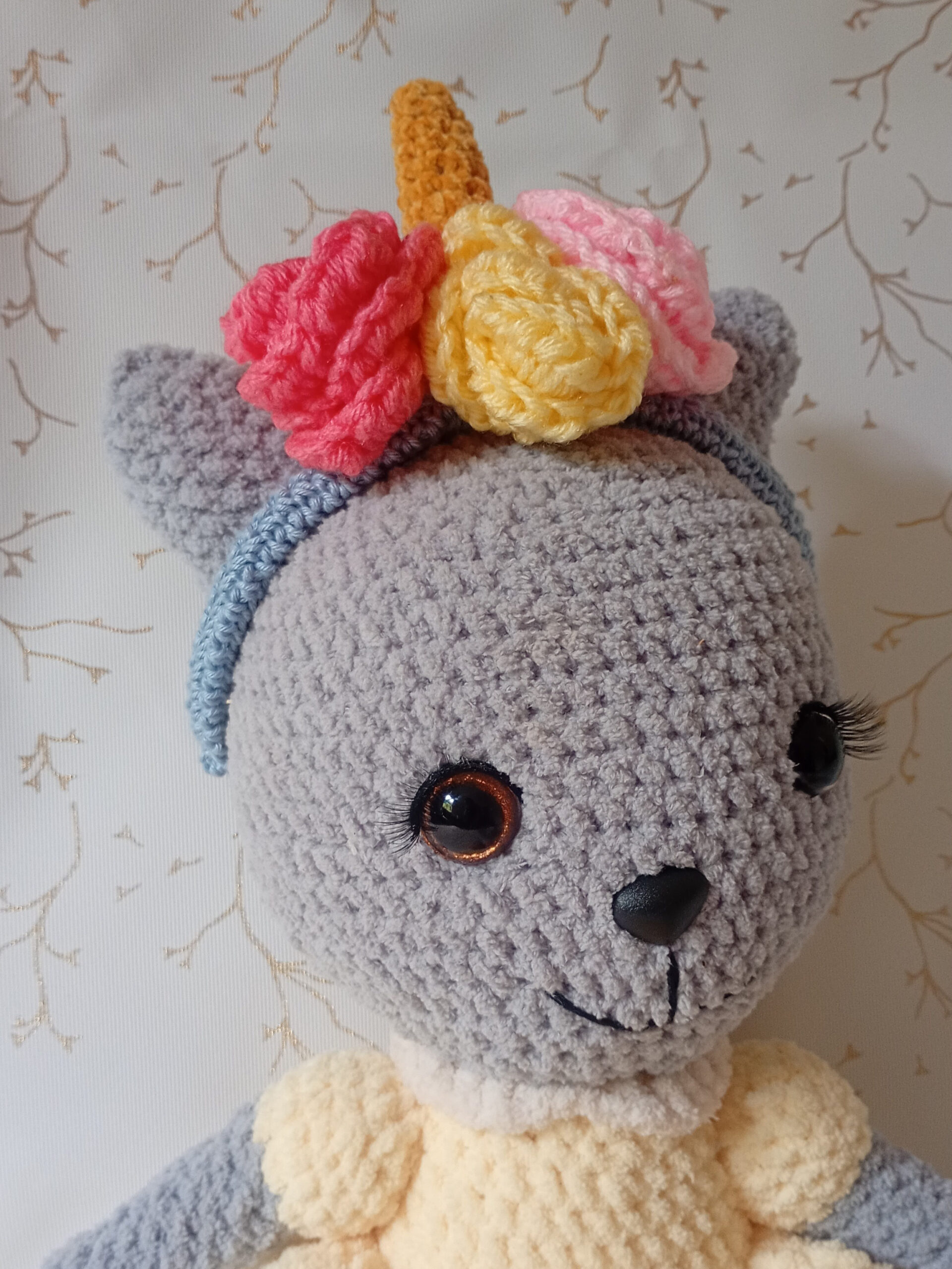 Gata amigurumi grande com tiara removível. Perfeita para a hora do chá ou para dormir, com seu fio macio. E para um toque de charme, cílios perfeitos para mostrar o quão fabulosa ela é.
